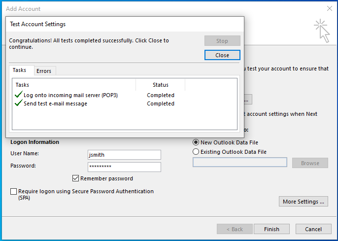 Back on the account details window, click Finish to test the connection settings. Click Close once tested.