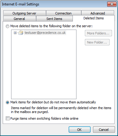 Select the Mark items for deletion but do not move them automatically and untick Purge items when switching folders while online. Click OK when finished. Click Next> on the Change Account window (you may untick the Test Account Settings by clicking the Next button if you wish). Click Finish and then Close on the remaining windows.