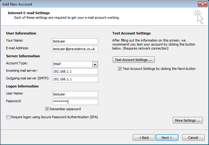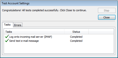 Back on the main page, ensure the Test Account Settings by clicking the Next button is ticked and click Next>. The Test Account Settings window will open for you to check that all is well. Click Close on the Test Account Settings window after the test has completed to proceed.