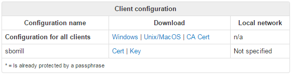 Your administrator may have chosen to keep key and certificate files separate from configuration files. If so, there will be more downloadable files (the same for all users). Please download the CA Cert as well as your key and certificate (if appropriate). Save all the files in the same place as the configuration file. Do not change any filenames. In the following example, there are 3 additional files to download: