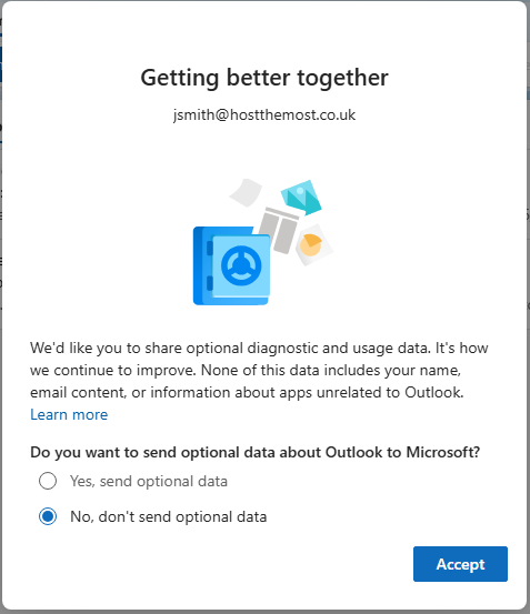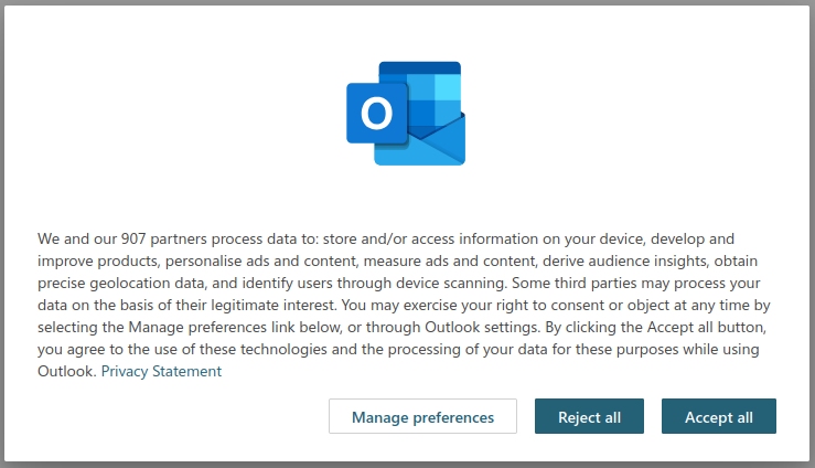 Note that your choice of email client wants to share your personal data with Microsoft and their 907 partners. Click on Reject all