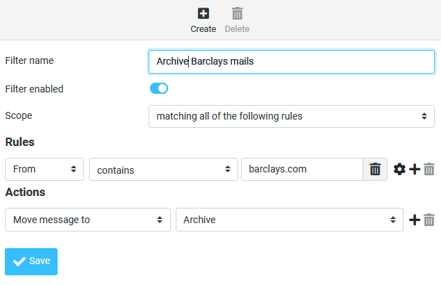 For example, here is a filter that will move any emails from barclays.com to a folder called Archive